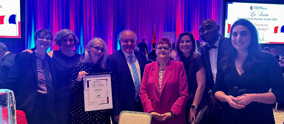 Toronto, le 17 mars 2026 — Lors du gala annuel de la Chambre de commerce France-Canada Ontario (FCCCO), tenu le 12 mars dernier, l’Université de l’Ontario français (UOF) a reçu le prix de la responsabilité sociale d’entreprise – « Corporate Social Responsibility », dans la catégorie Petite Moyenne Entreprise. Cette distinction souligne l’engagement de l’université envers la responsabilité sociale qui se trouve de fait au coeur de son ADN tant dans sa mission, que dans sa gouvernance, son fonctionnement interne, les valeurs transmises dans ses programmes études et ses initiatives de recherche.